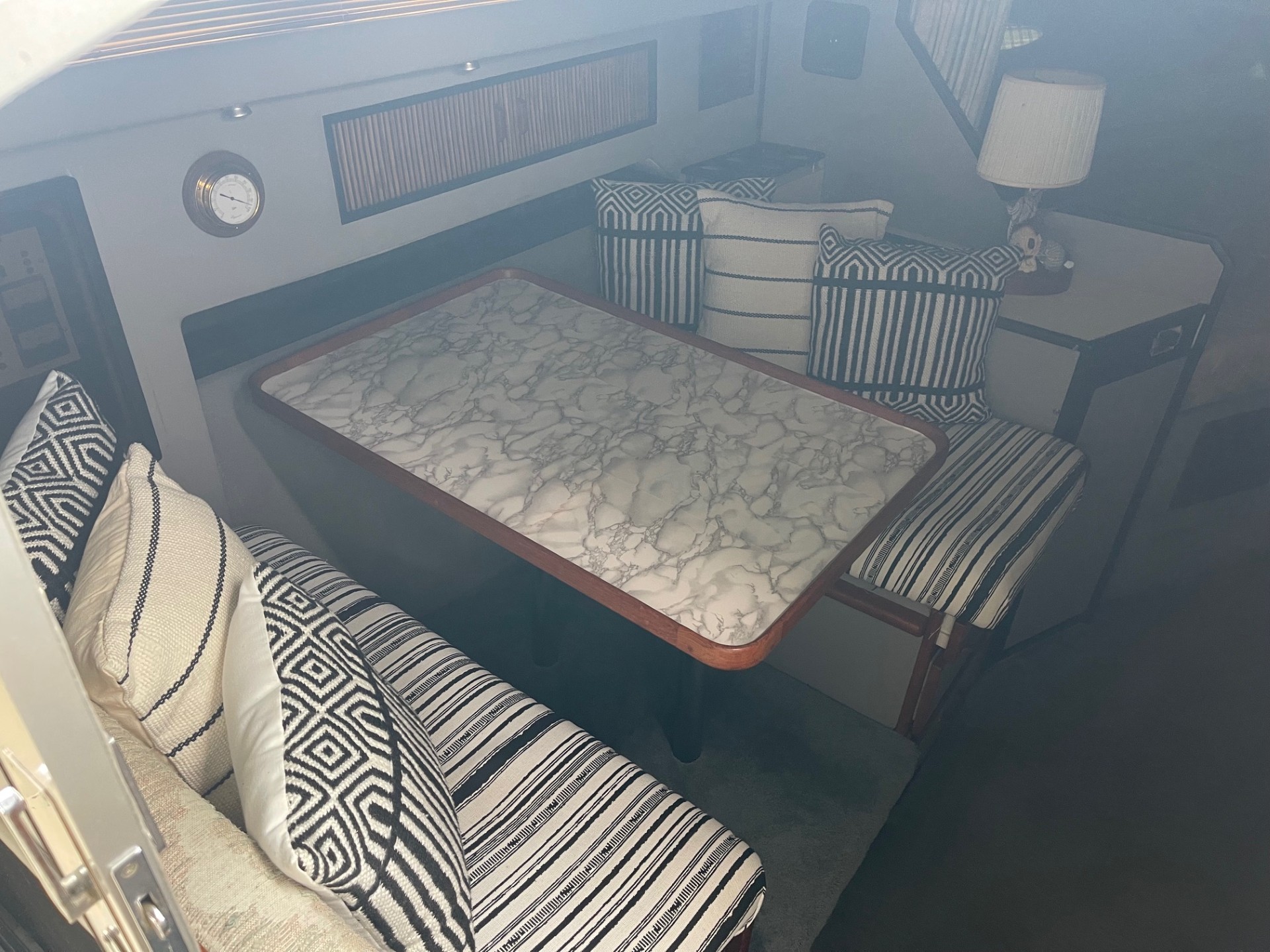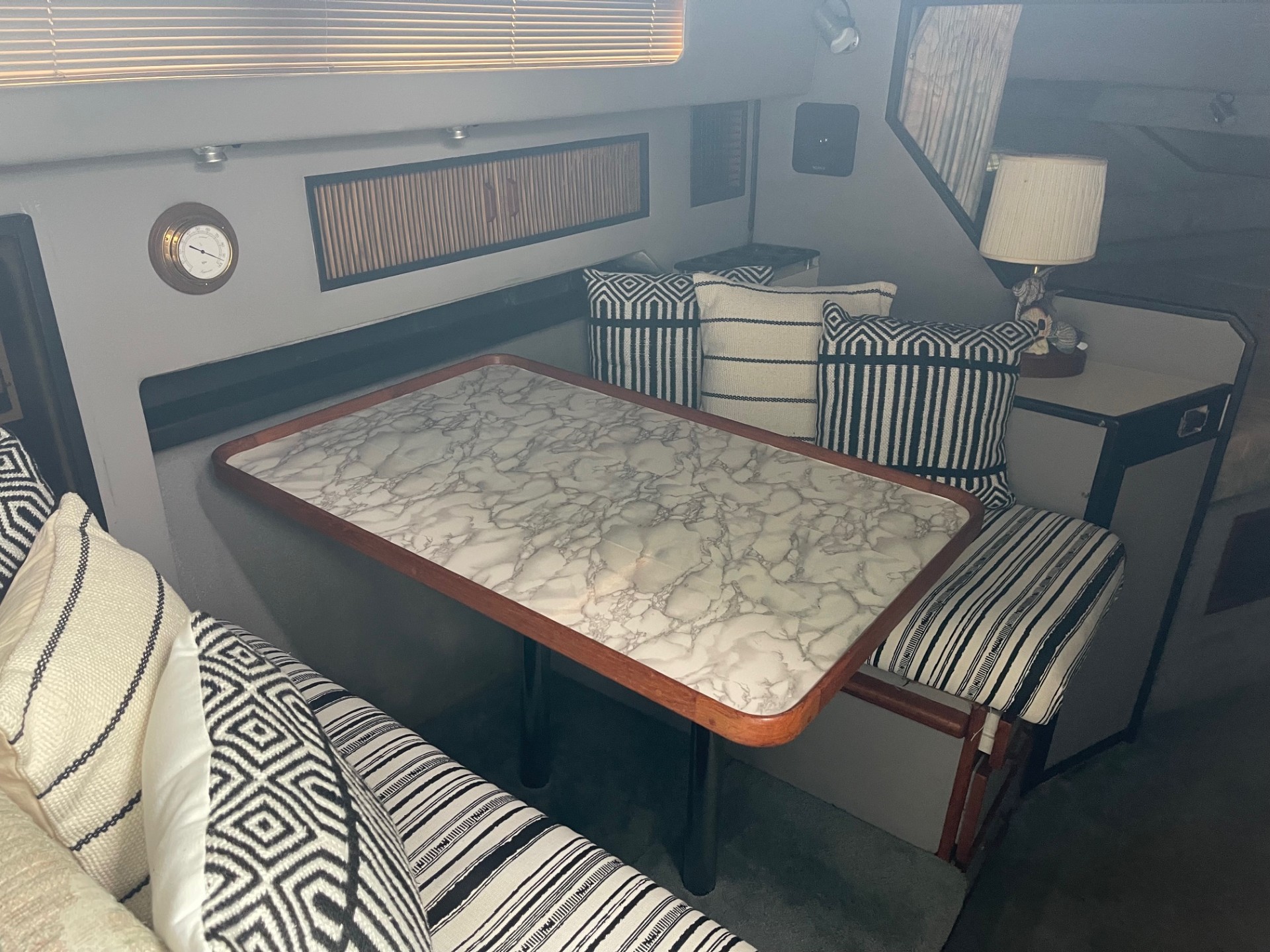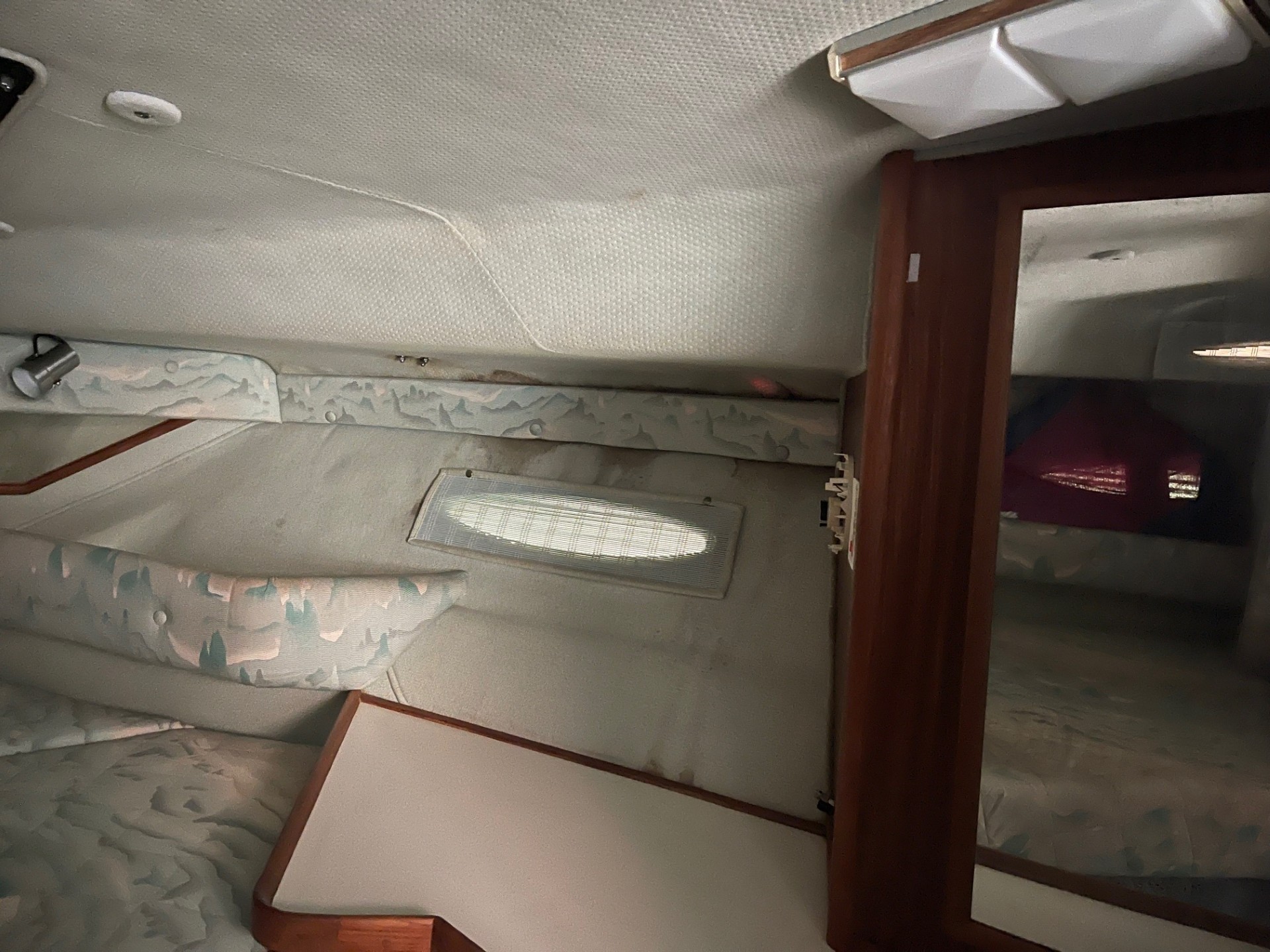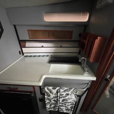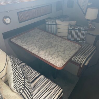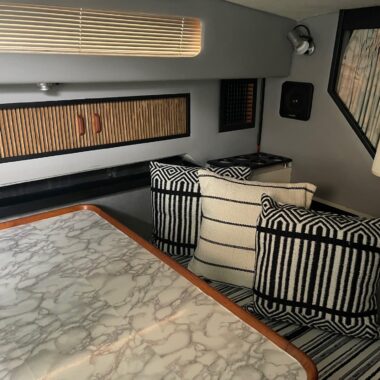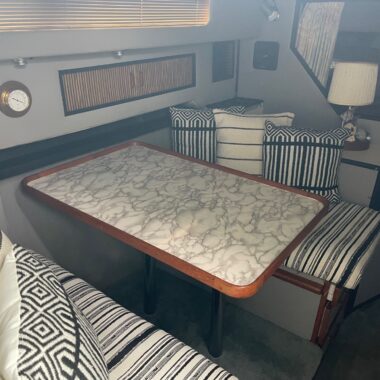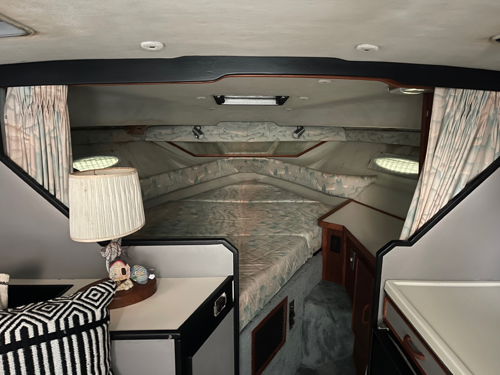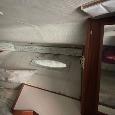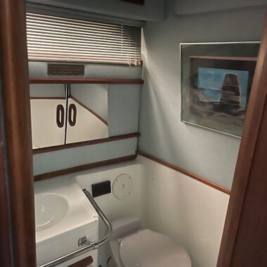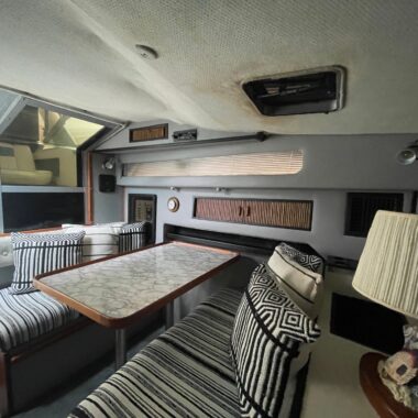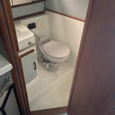 The exterior and deck need a good cleaning, but the boat has been priced accordingly and represents a strong value for someone wanting a clean-up project with low-hour power. The cabin, galley, and enclosed head are all in clean, usable condition, and the bathroom presents well for its age.