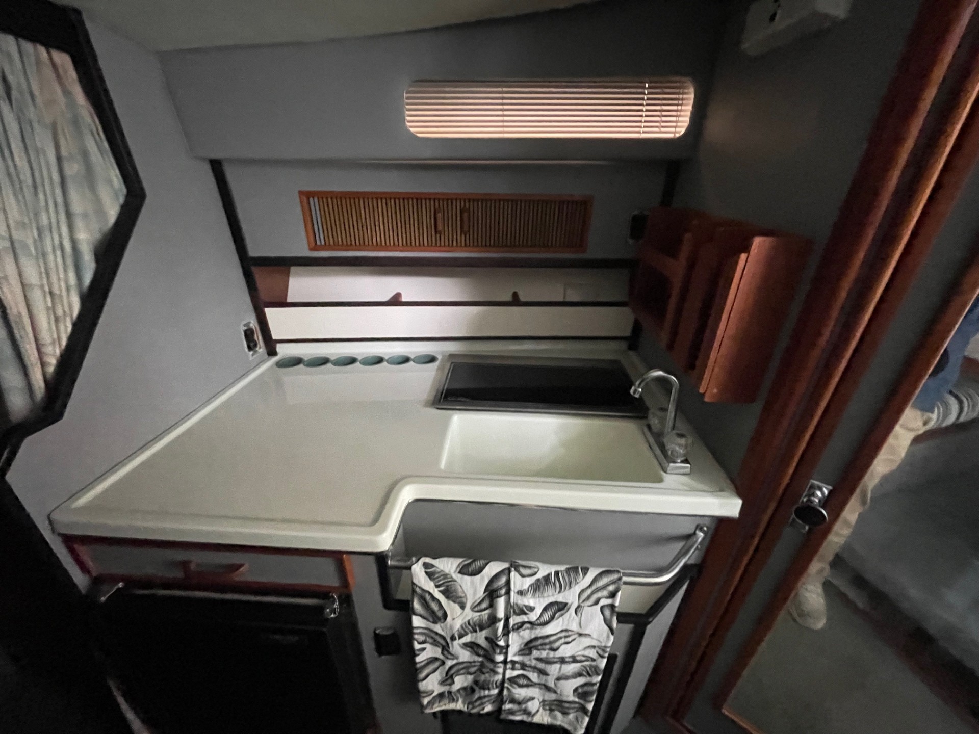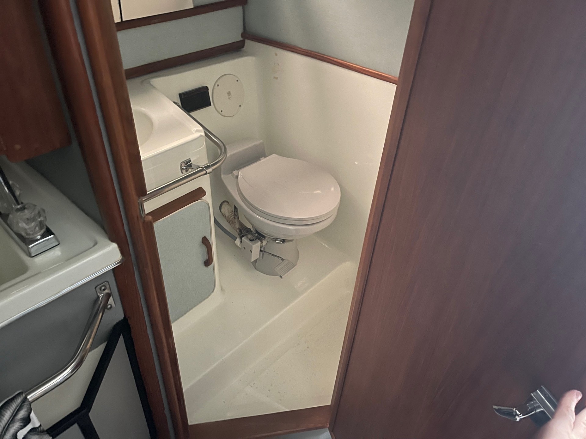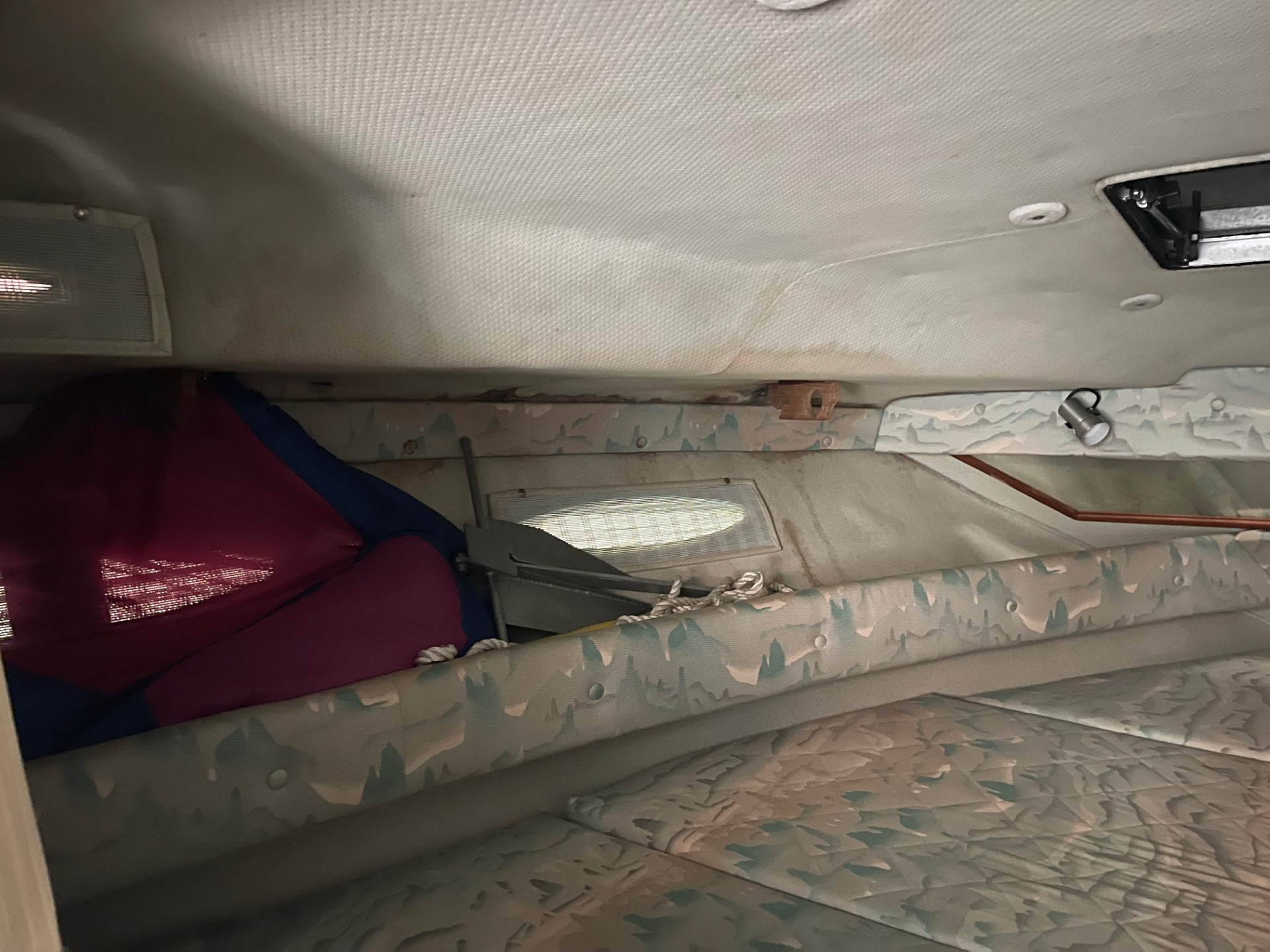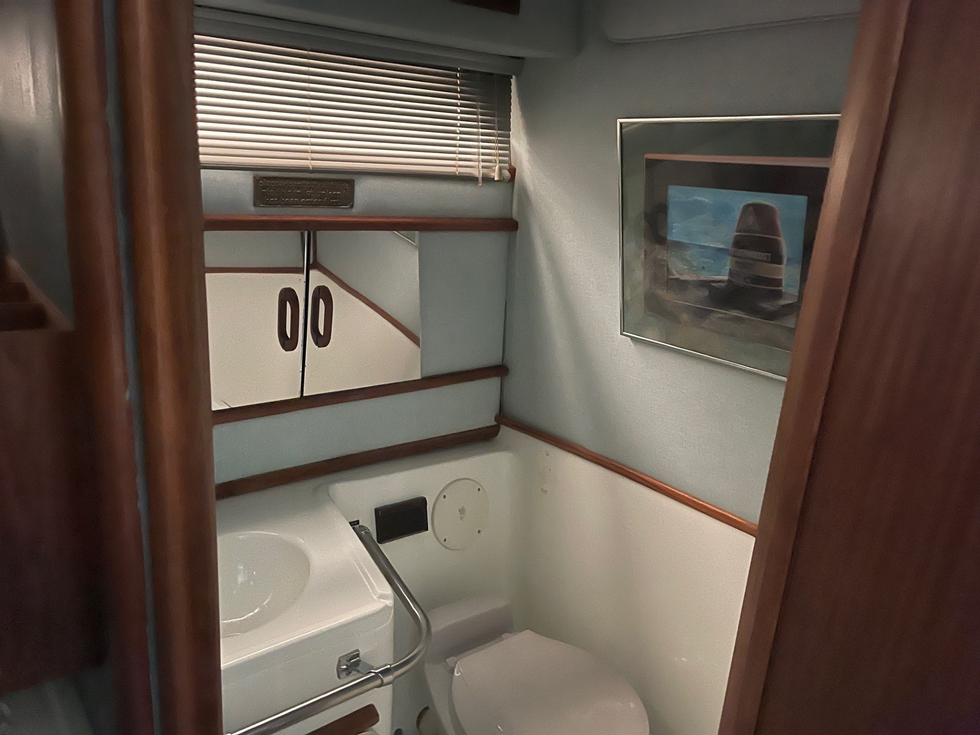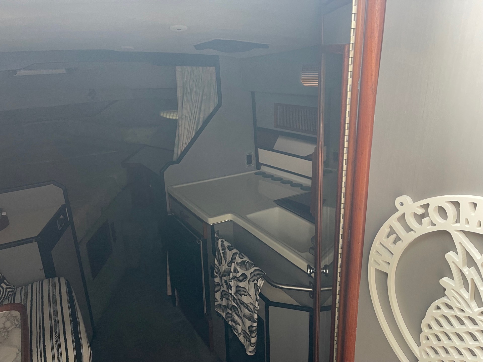 The exterior and deck need a good cleaning, but the boat has been priced accordingly and represents a strong value for someone wanting a clean-up project with low-hour power. The cabin, galley, and enclosed head are all in clean, usable condition, and the bathroom presents well for its age.