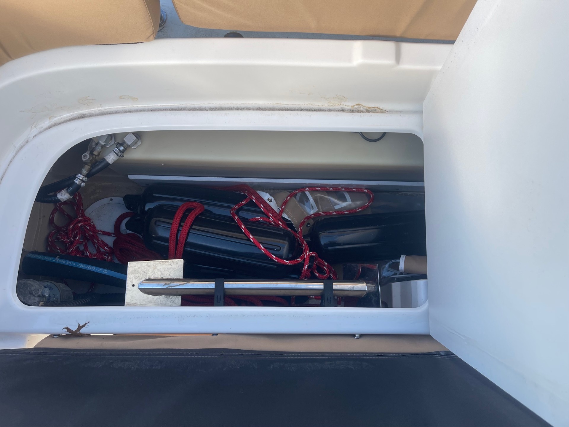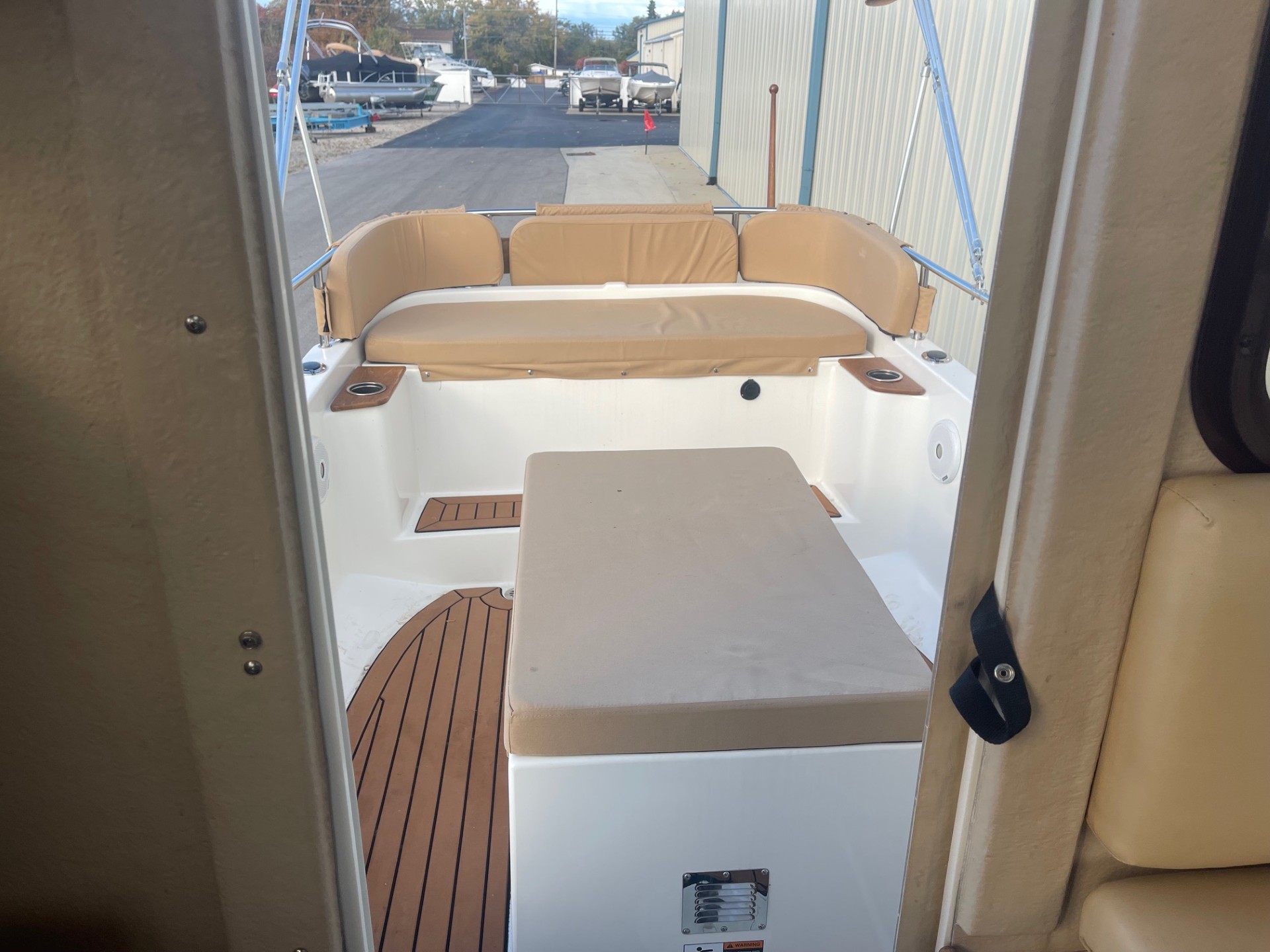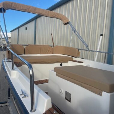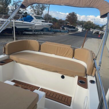 Cockpit: Spacious aft cockpit ideal for fishing, lounging, or docking; features removable seating and easy access to engine compartment.