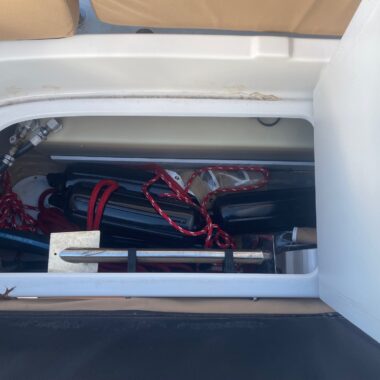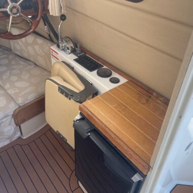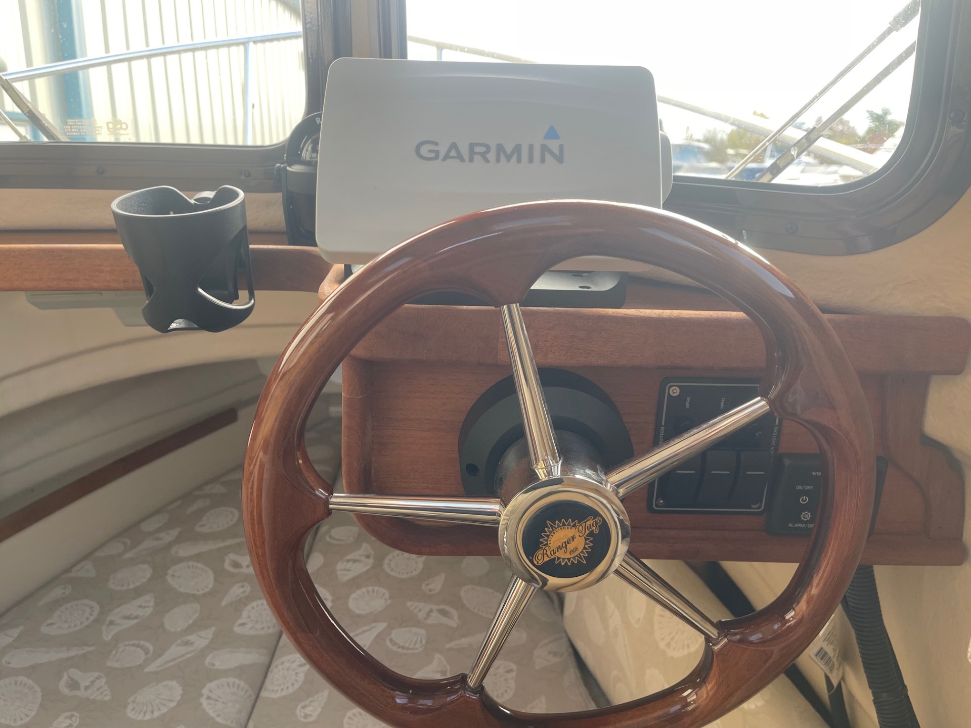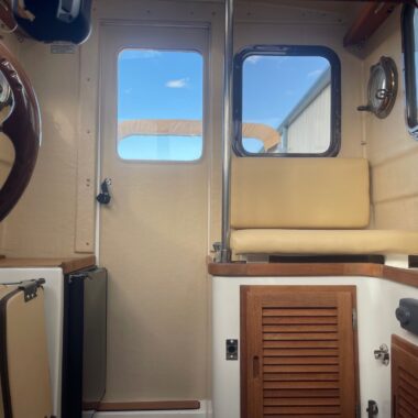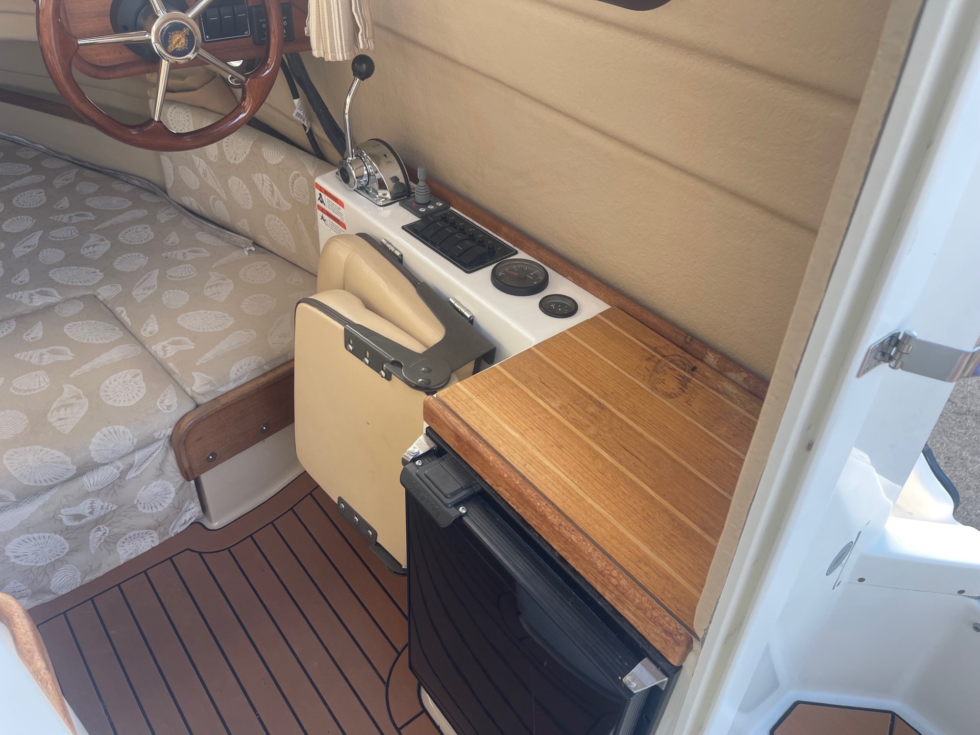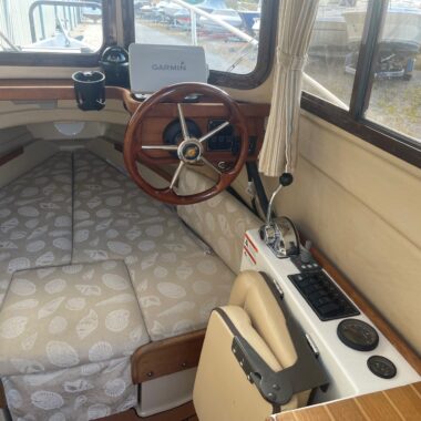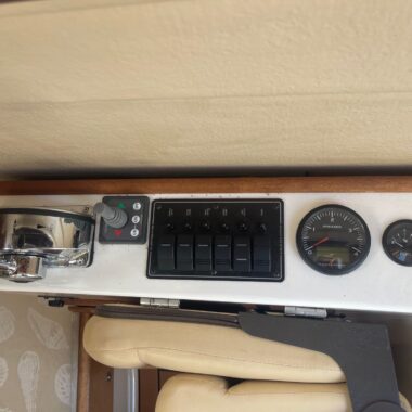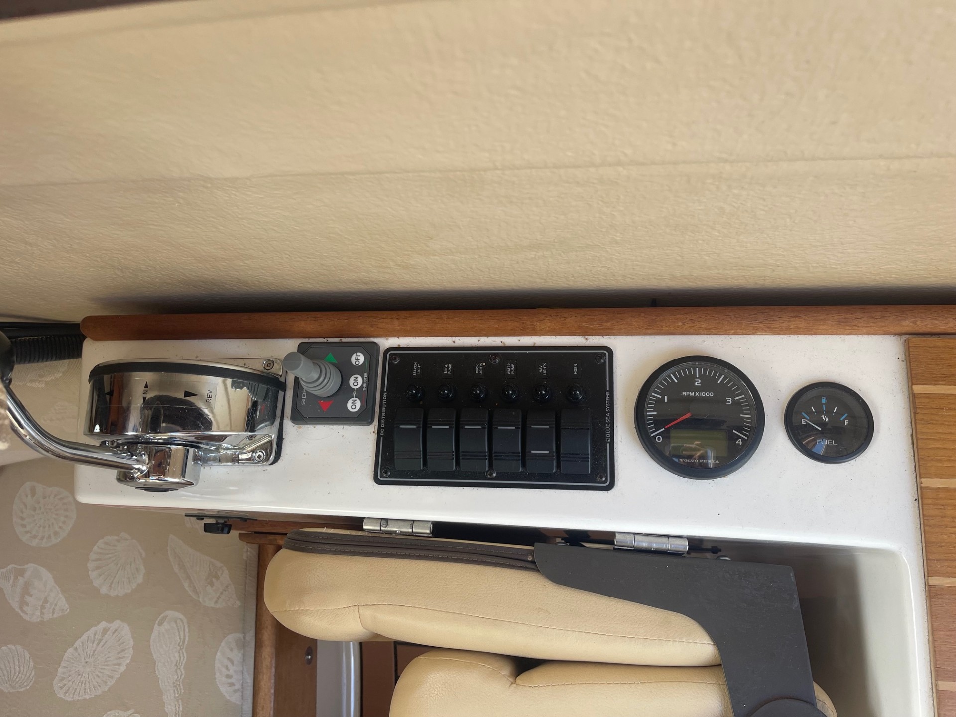 Helm Station: Full instrumentation with clear visibility, trim tab controls, and easy engine access.