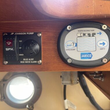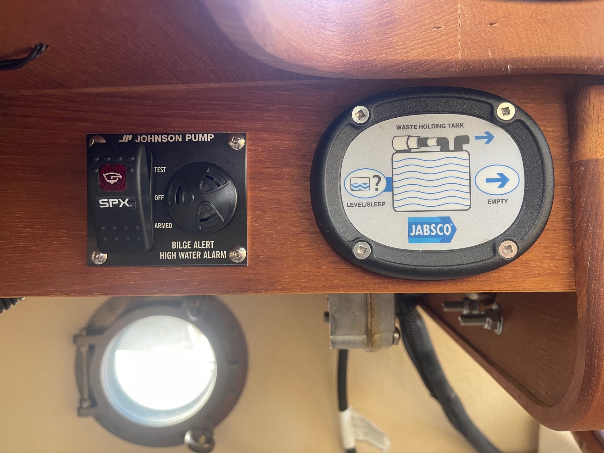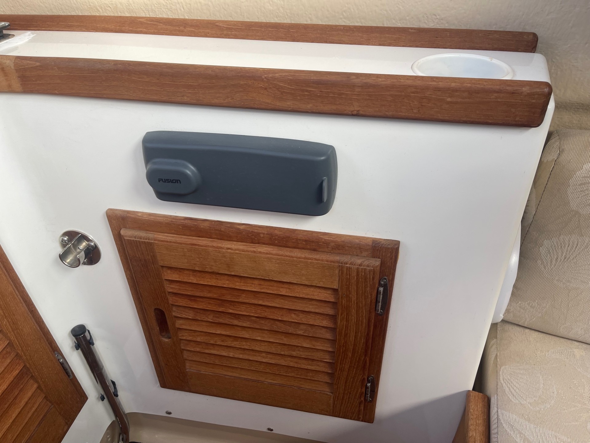 Comfortable Cabin: Forward V-berth sleeps two; interior features warm teak accents, marine stereo, and ample storage.