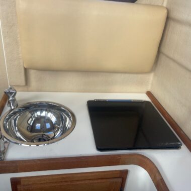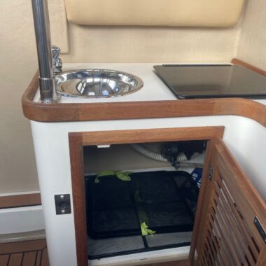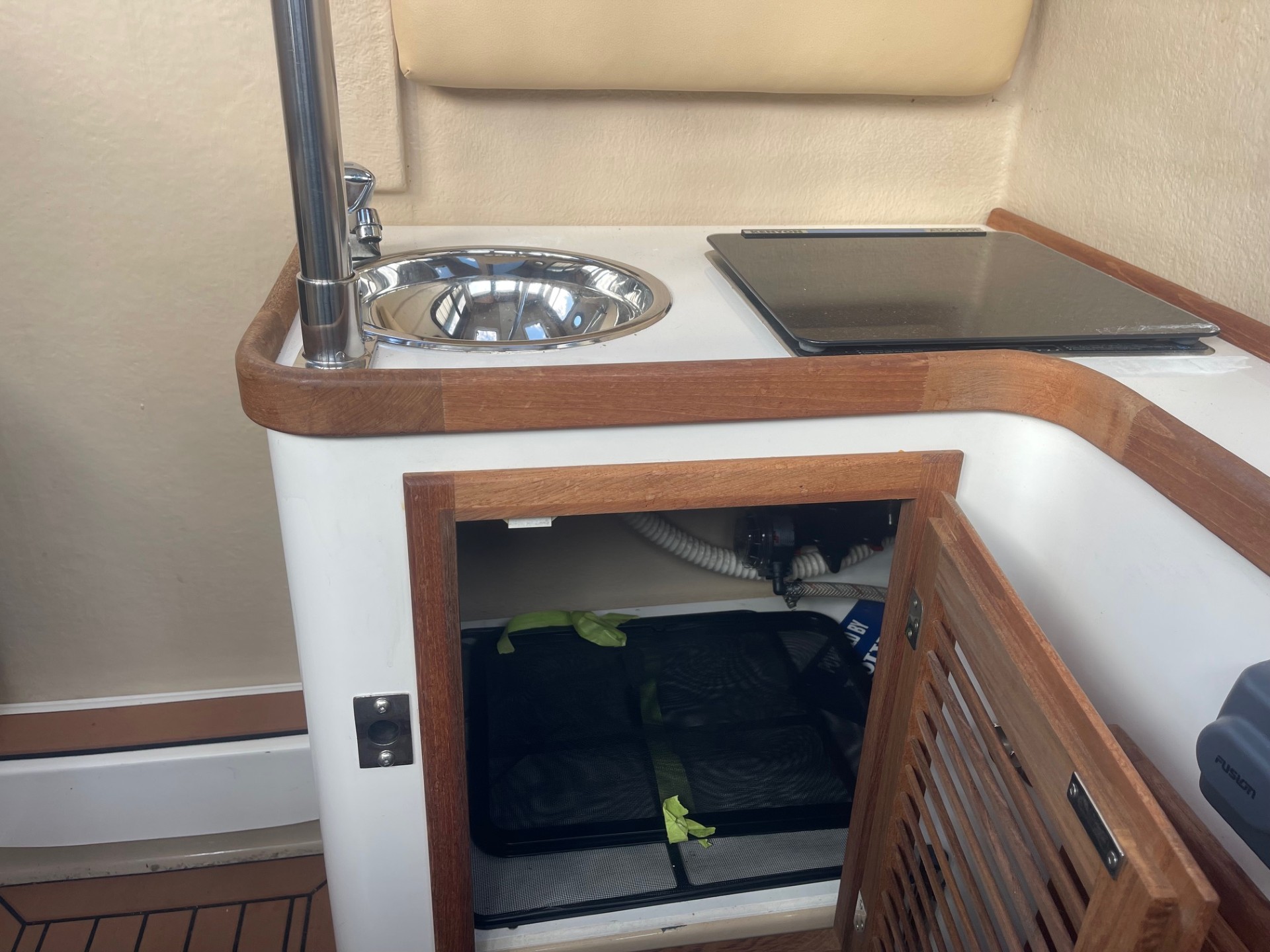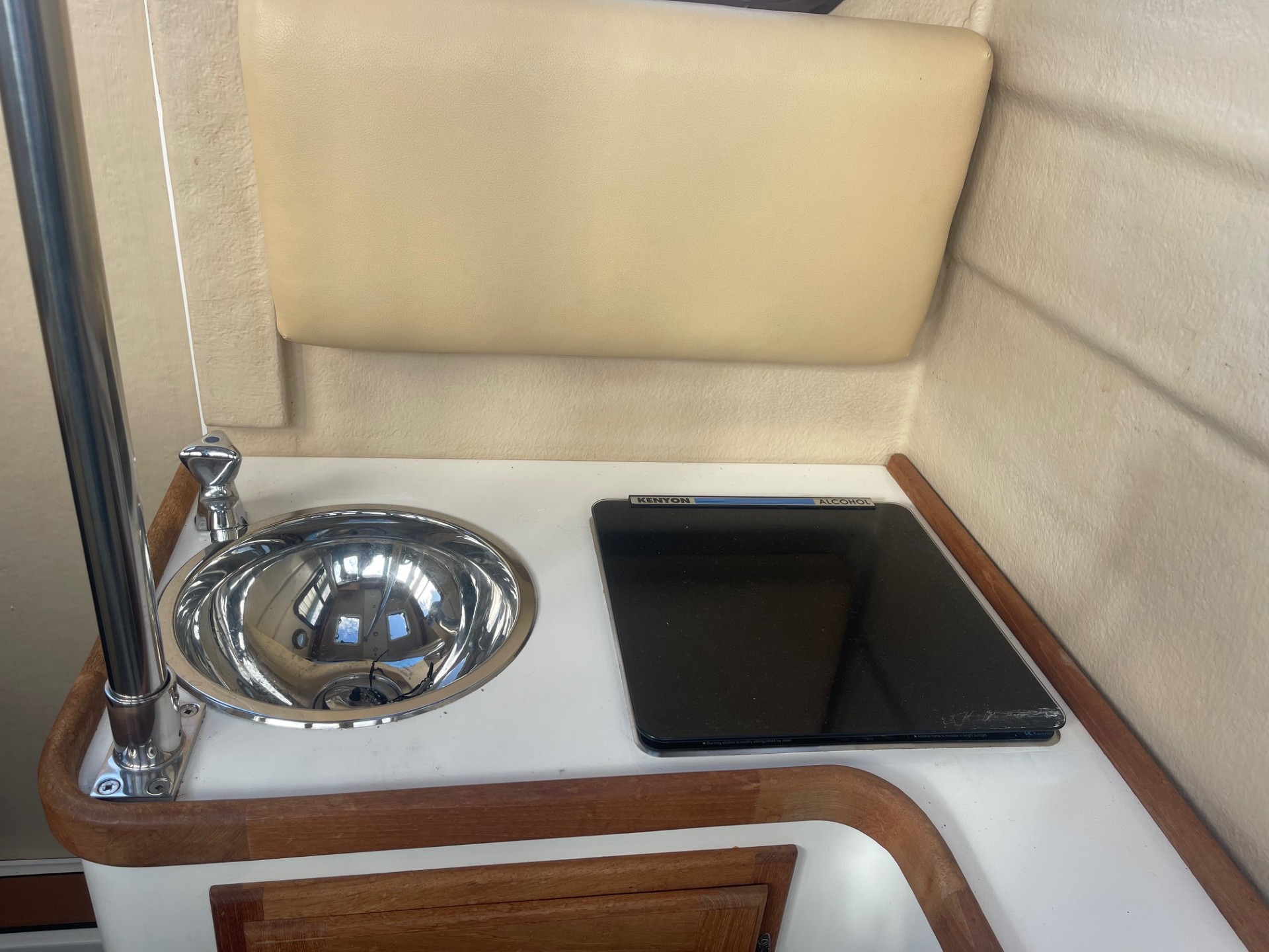 Compact Galley: Stainless sink, freshwater system, and single-burner stove for convenient onboard cooking.